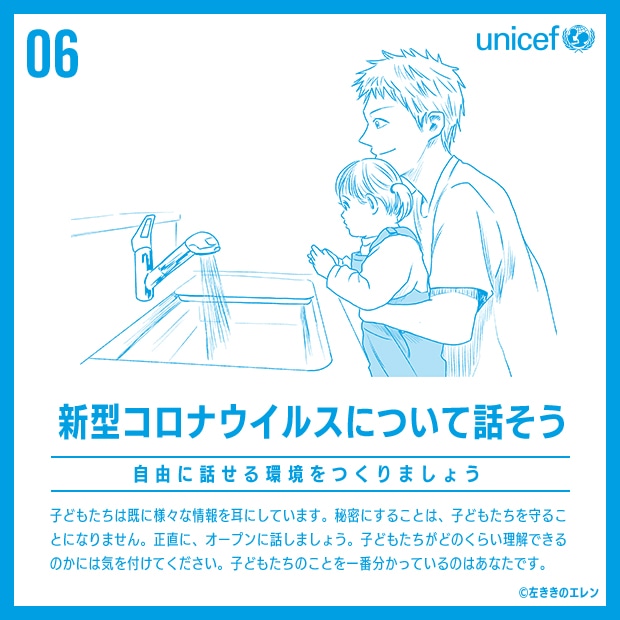 漫画家かっぴー氏の無償協力により制作された本作品は、ユニセフ(国連児童基金)が2020年4月10日(金)に発信した「ユニセフの子育て6つのヒント」を、漫画『左ききのエレン』とのコラボレーションを通じて伝えるものです。