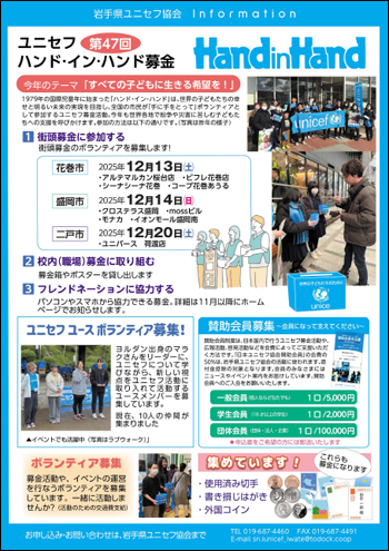 岩手県ユニセフ協会 事務局 電話:019-687-4460(月~木 10時から15時)