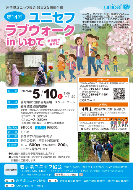 岩手県ユニセフ協会(日本ユニセフ協会協定地域組織)・岩手県ウォーキング協会・盛岡市ウォーキング協会の3団体が共催、第14回ユニセフ・ラブウォークin いわて2026実行委員会が企画運営する「第14回ユニセフ・ラブウォークinいわて2026」を来る5月10日(日)に開催を予定しています。